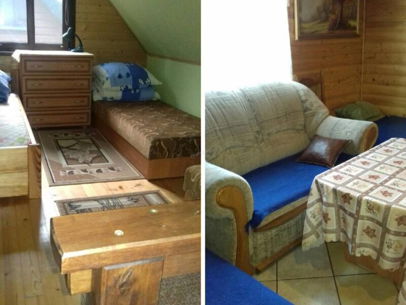 - Parter: pokój z kanapą i łóżkiem piętrowym, dodatkowe pomieszczenie z kanapą dwuosobową i TV