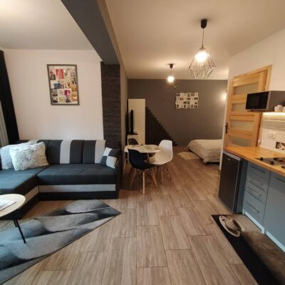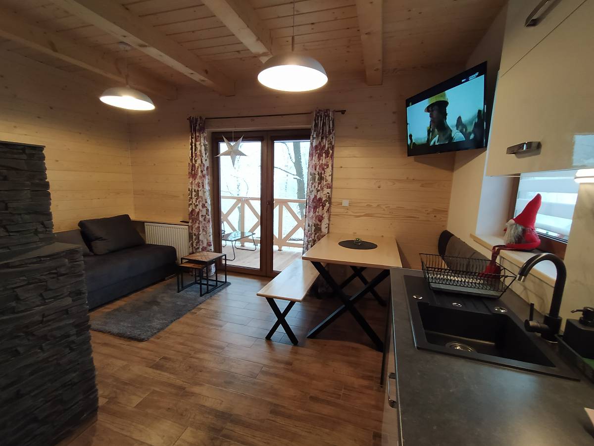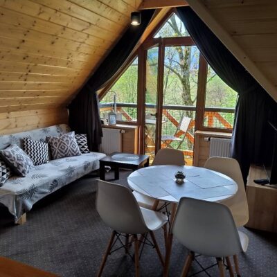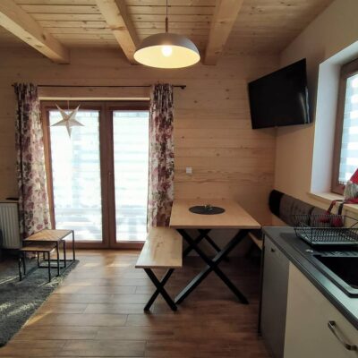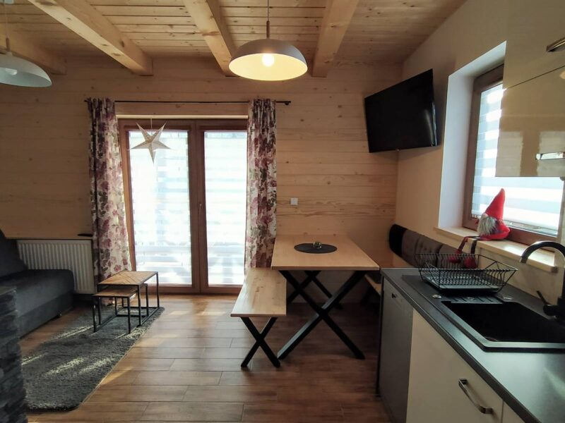 - Salon z telewizorem 32″, aneks kuchenny i wyjście na taras