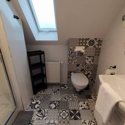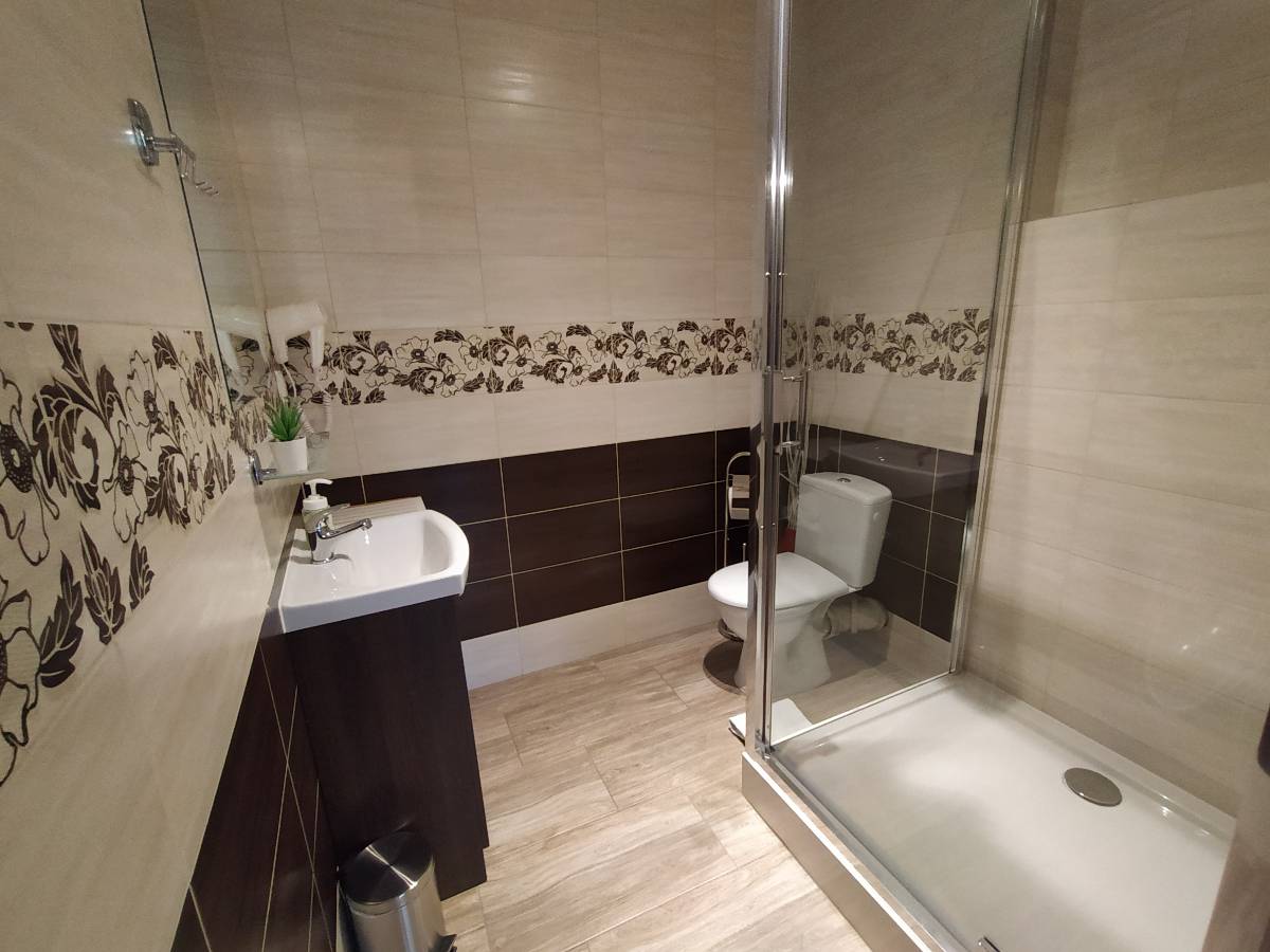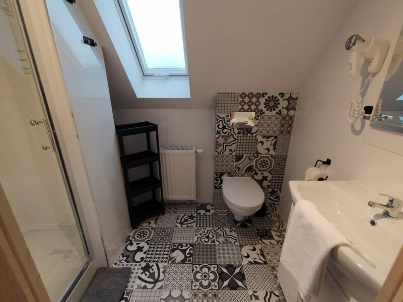 - Łazienka z prysznicem, suszarką do włosów i ręcznikami