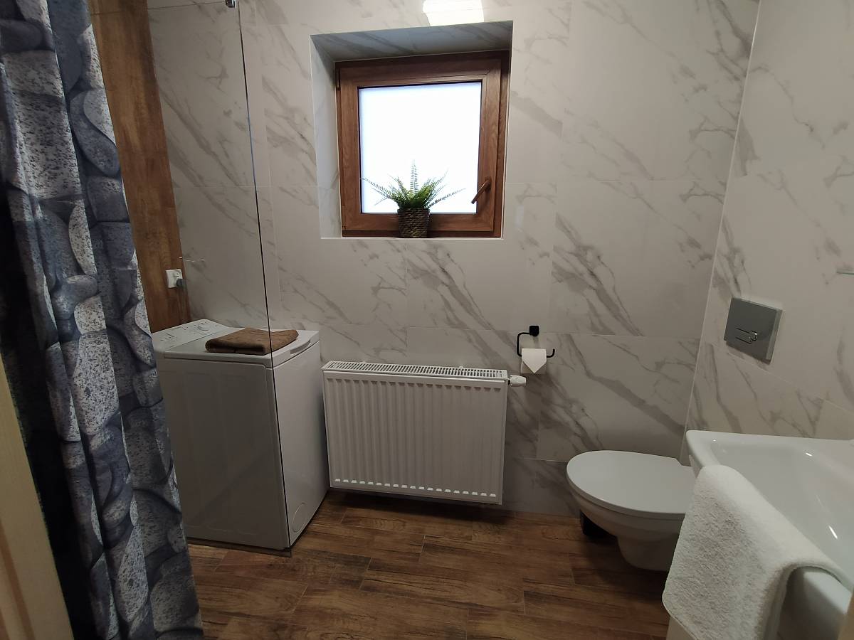 - Łazienka z prysznicem, suszarką do włosów i ręcznikami oraz pralka