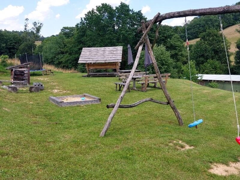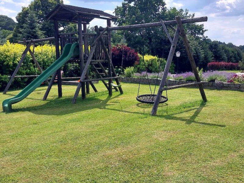 🎡 Strefa dla dzieci – huśtawki, piaskownica i domek do zabawy.