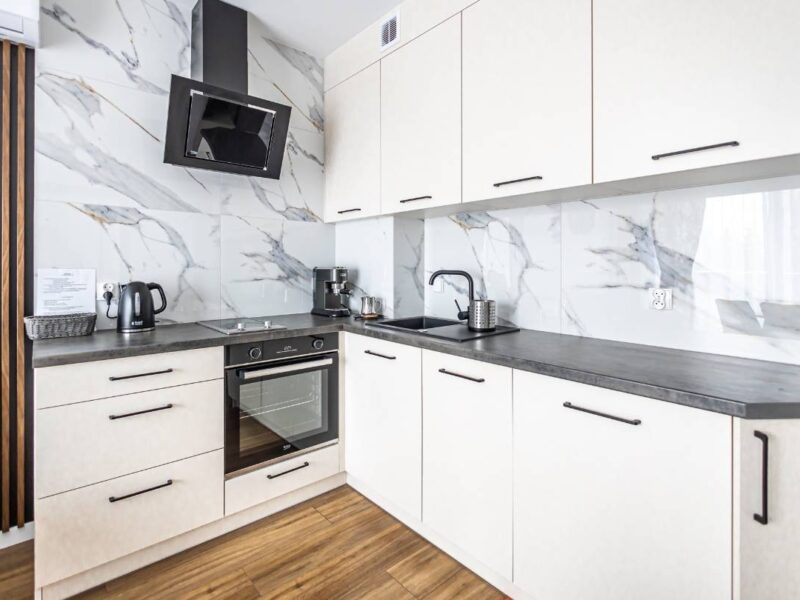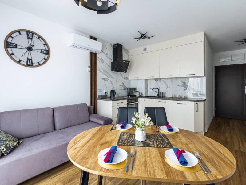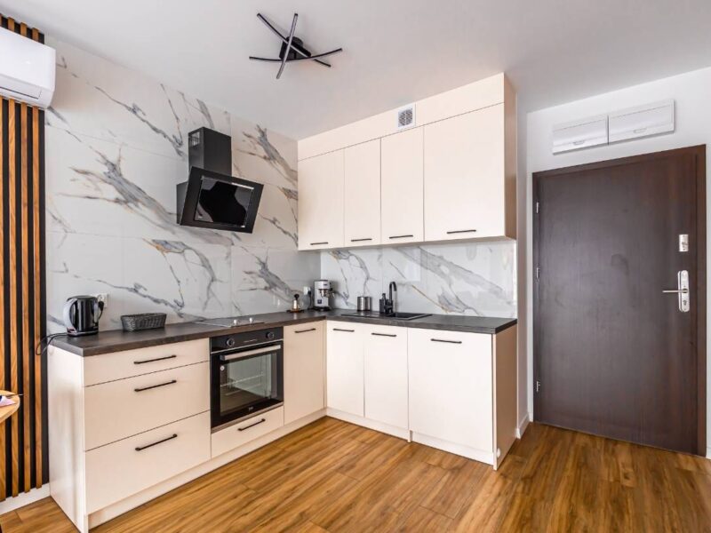 ✔ W pełni wyposażoną kuchnię – płyta grzewcza, lodówka, zmywarka, czajnik, ekspres do kawy, komplet naczyń i zastawa stołowa.