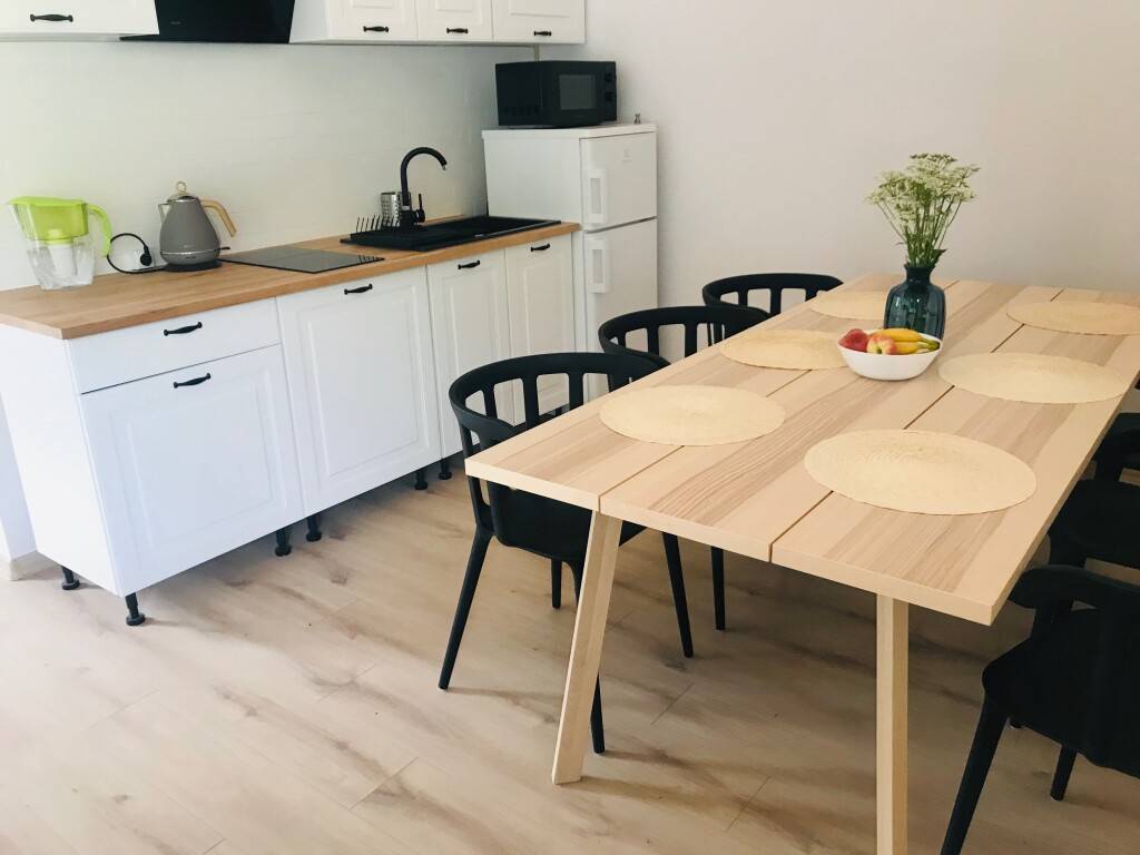 - 🍳 Kuchnia z pełnym wyposażeniem i jadalnia z dużym stołem,