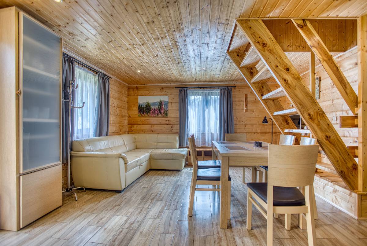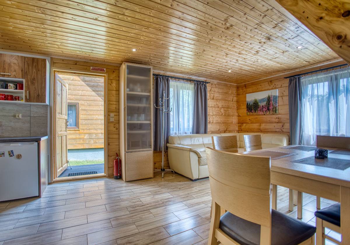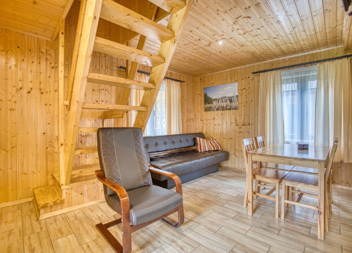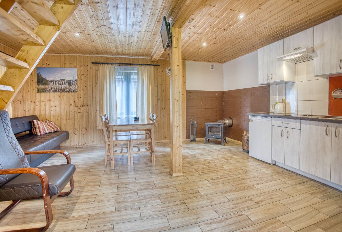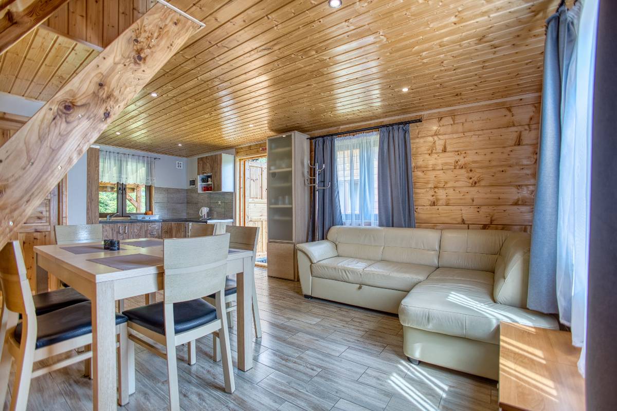 - 🛋️ Salon z aneksem kuchennym – parter każdego domku wyposażony jest w wygodną część wypoczynkową i w pełni urządzoną kuchnię,