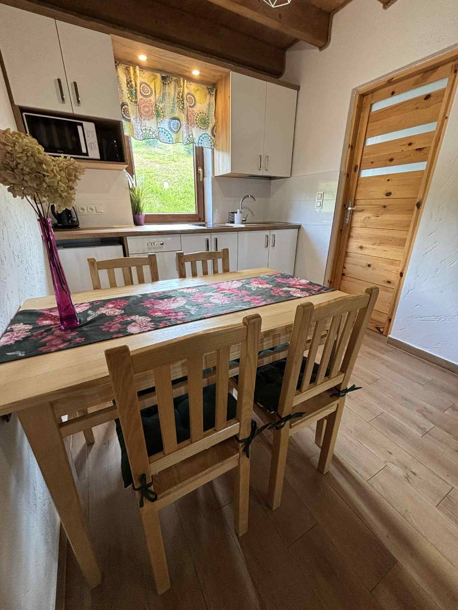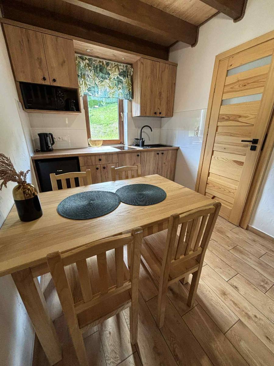 - 🍽 W pełni wyposażoną kuchnię – z lodówką, płytą kuchenną, mikrofalówką i niezbędnymi akcesoriami.