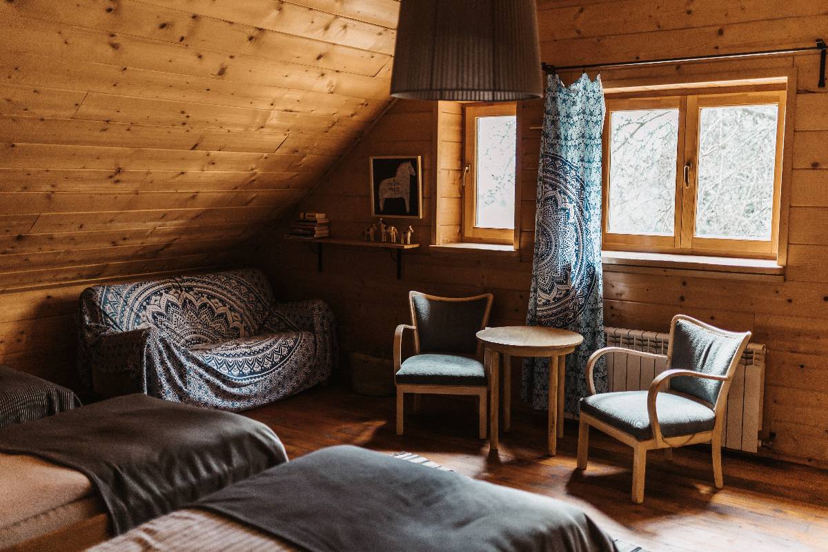 Chałupa została przygotowana z myślą o pobytach rodzinnych oraz wyjazdach grupowych. Łącznie może komfortowo pomieścić 12–16 osób (z możliwością dodatkowych dostawek).