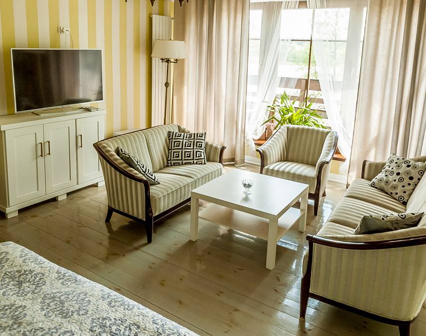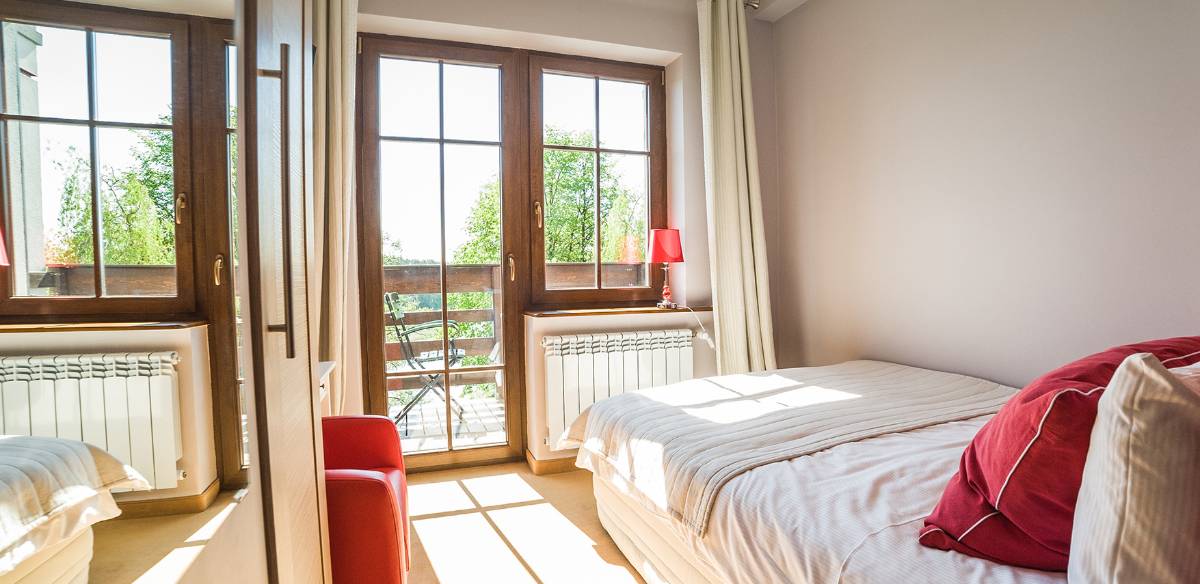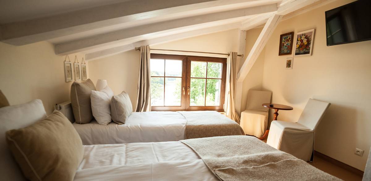 - Pokoje 2-osobowe w budynku głównym – od 300 zł/doba (część pokoi z balkonem lub widokiem na jezioro)