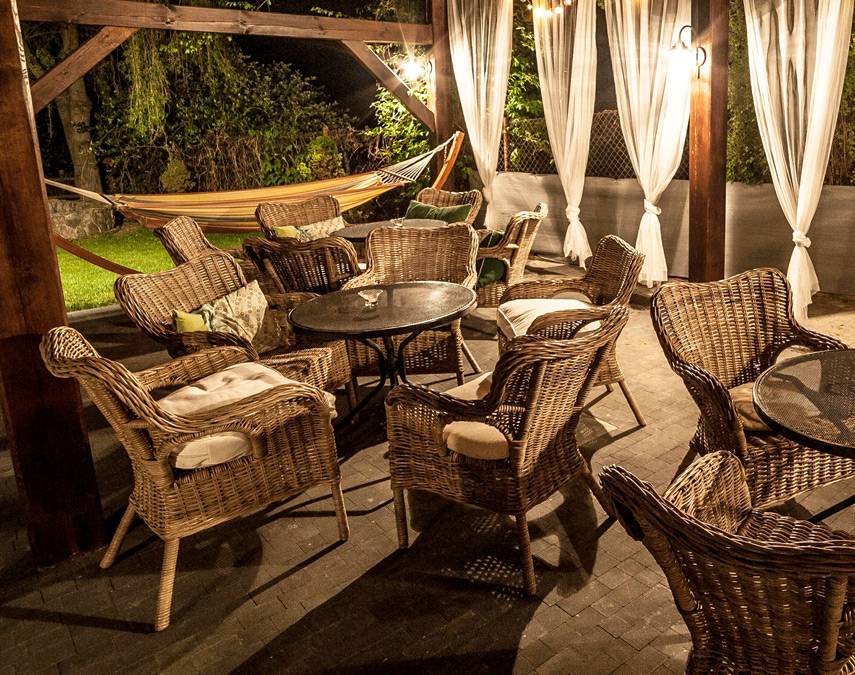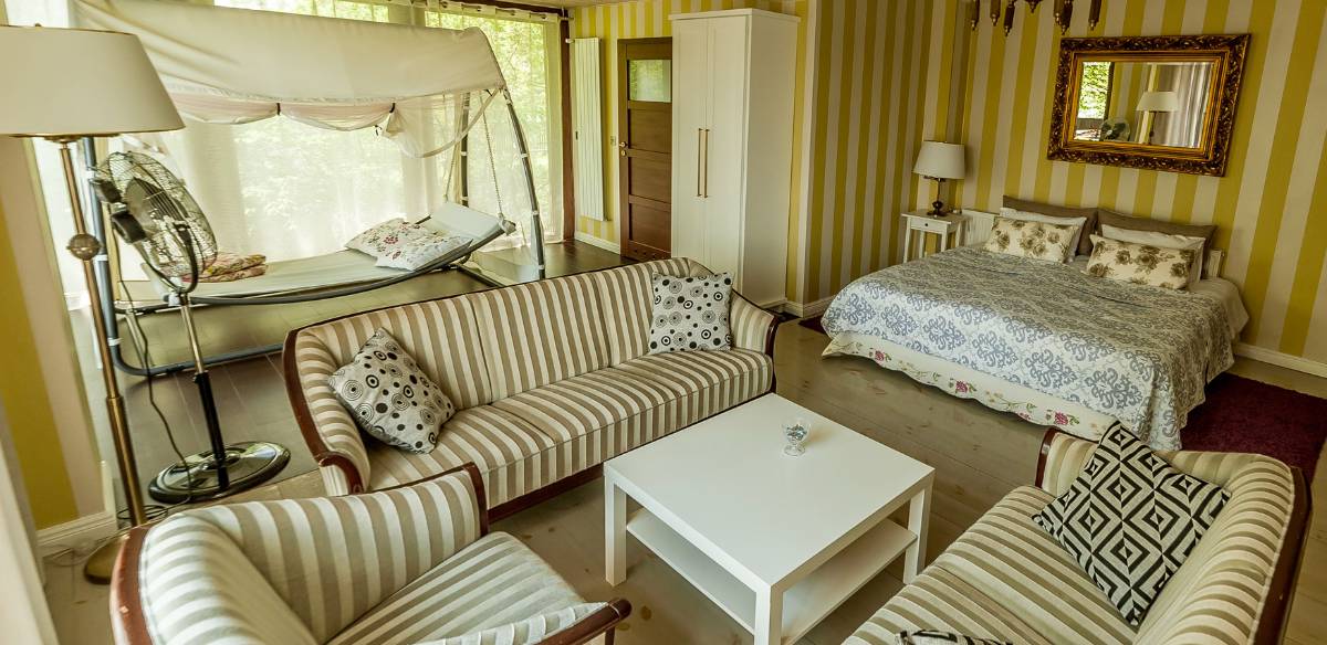 - Pokoje 2-osobowe w domkach w ogrodzie – 270 zł/doba (wyjście do ogrodu, widok na jezioro)