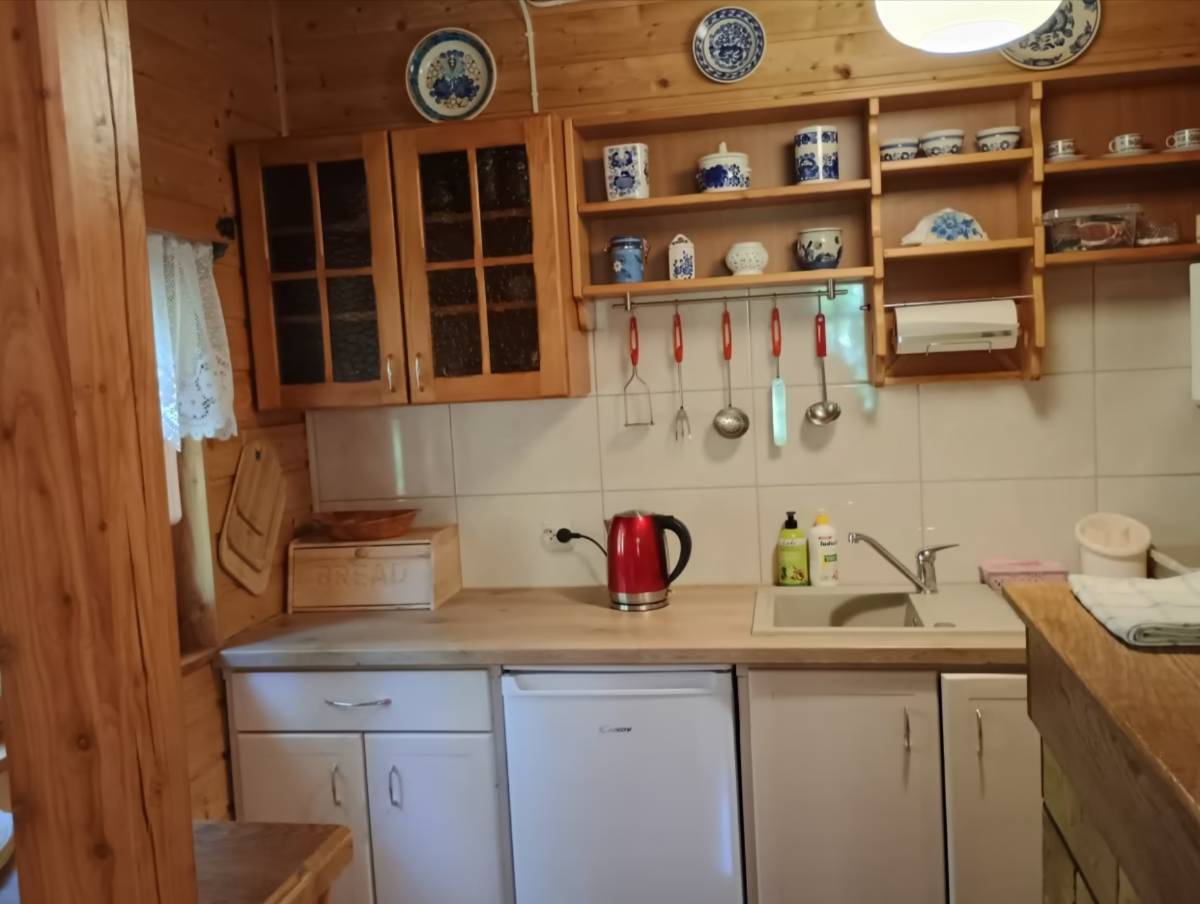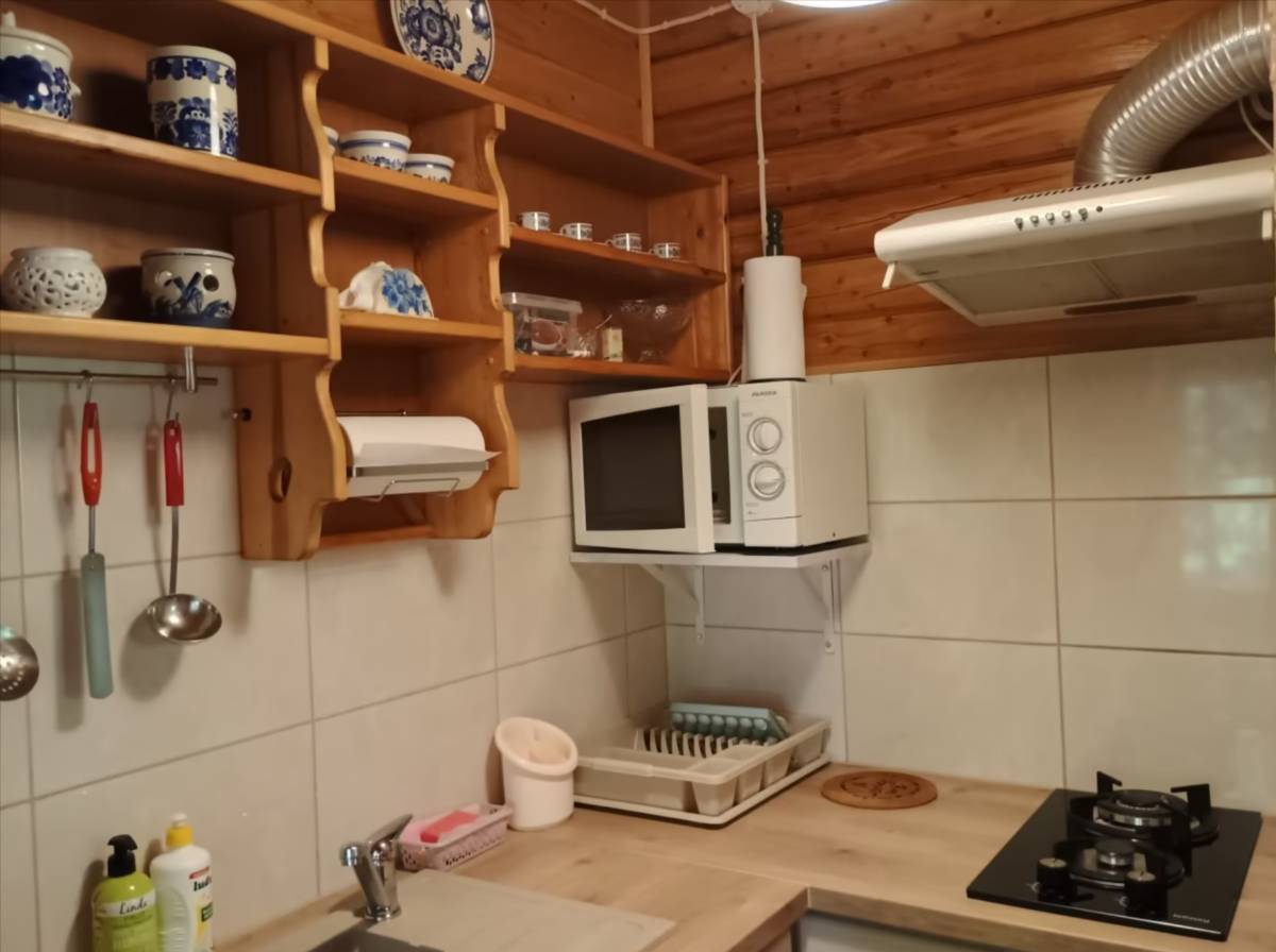 - aneks kuchenny z lodówką, kuchenką gazową, mikrofalówką, czajnikiem oraz kompletem naczyń,