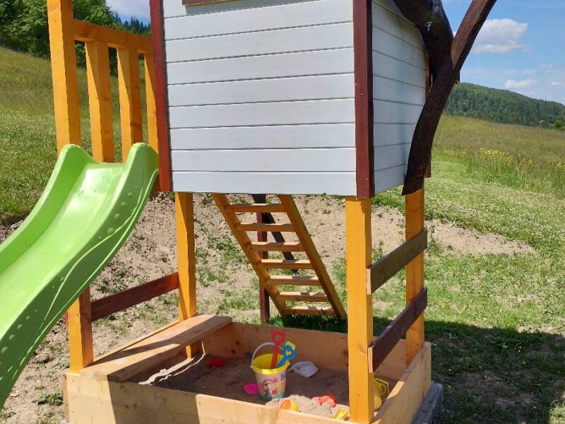 - 🌳 Ogród z placem zabaw – huśtawki, piaskownica i zjeżdżalnia dla dzieci.