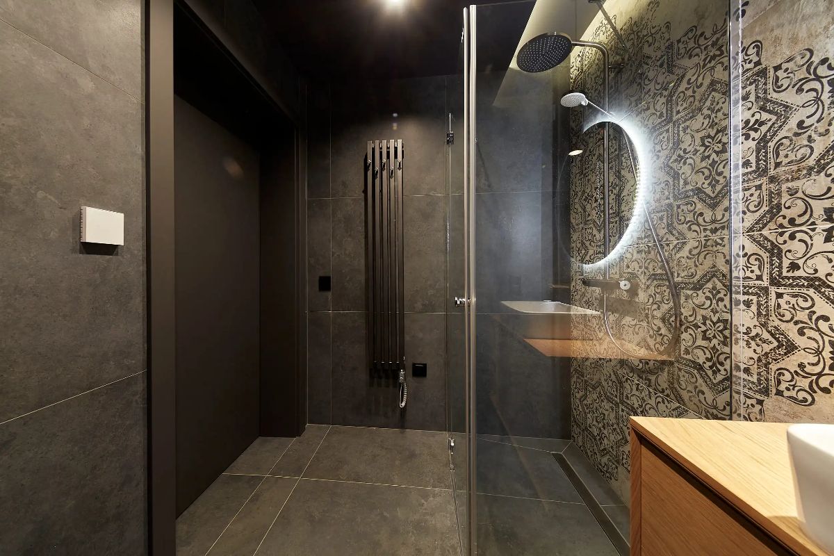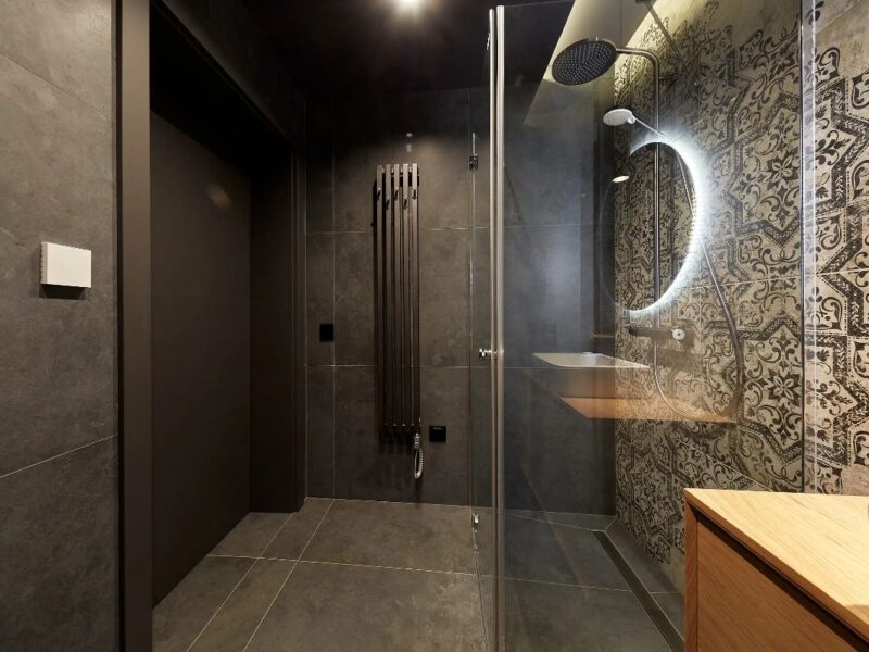 - 🛁 Nowoczesna łazienka z prysznicem, ręcznikami i suszarką do włosów.