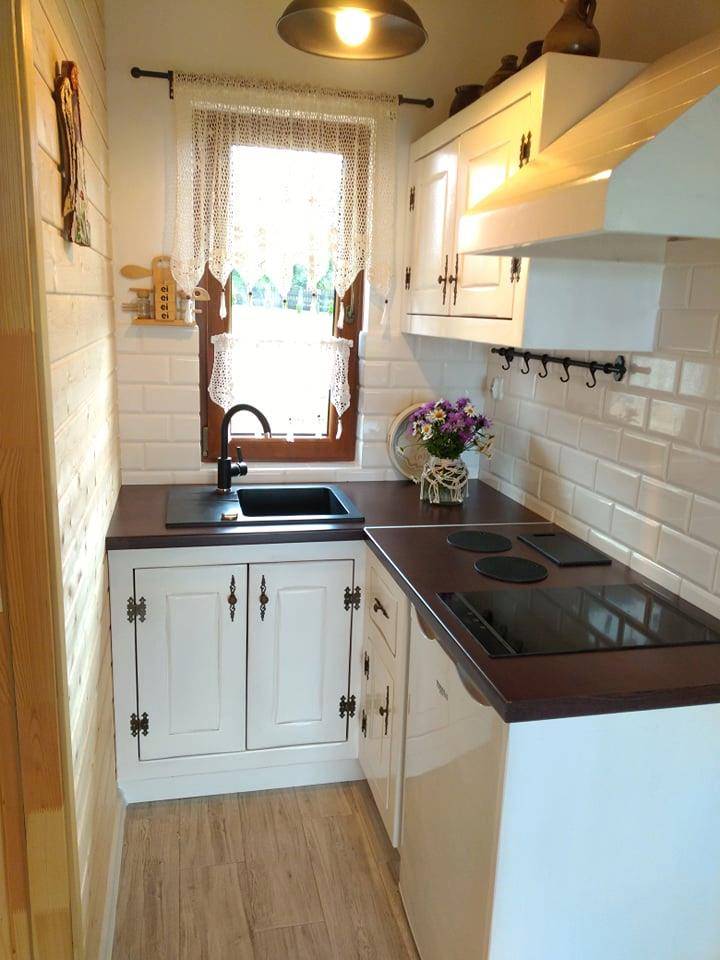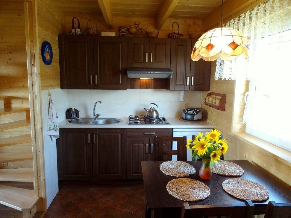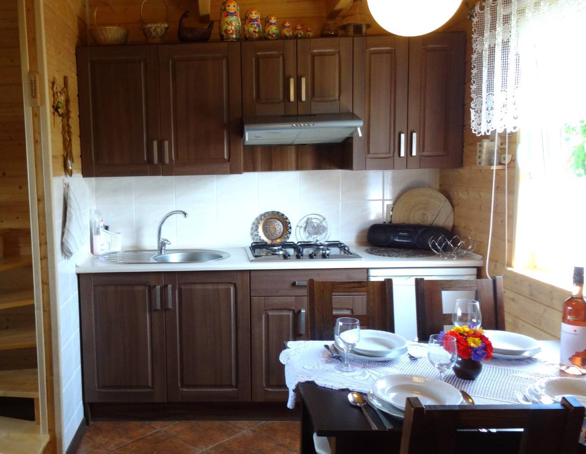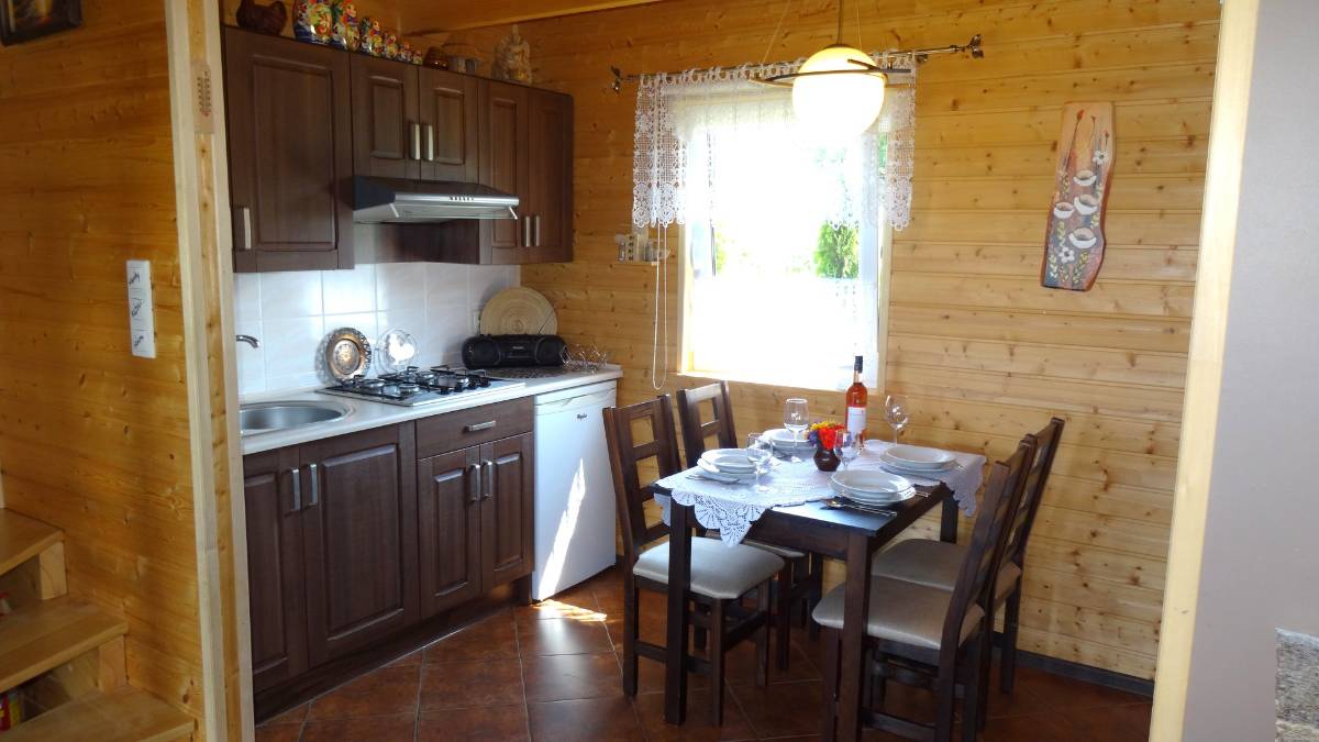 - W pełni wyposażony aneks kuchenny (lodówka, płyta grzewcza, naczynia, sztućce)