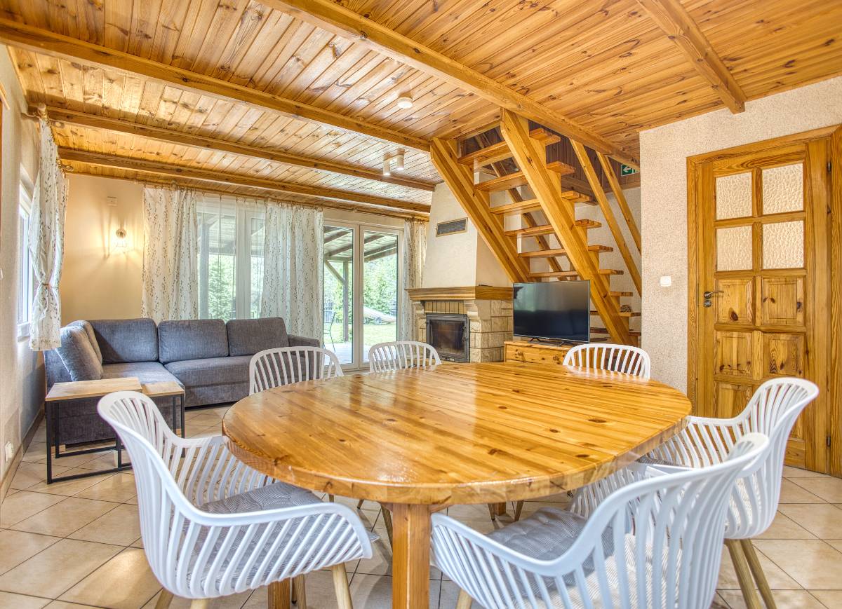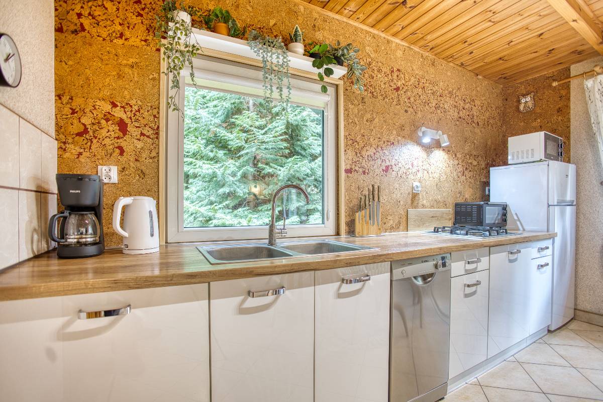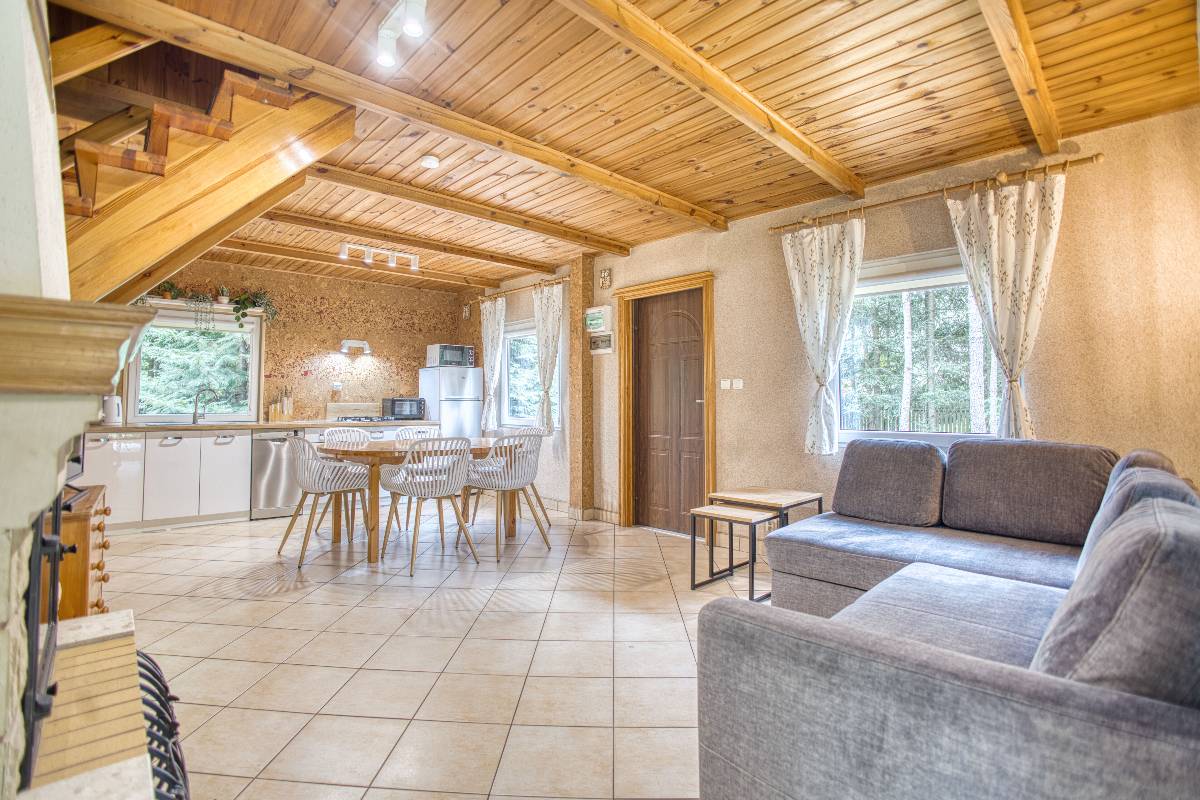 - 🍳 Kuchnia z jadalnią – bogato wyposażona (kuchenka gazowa, zmywarka, lodówka, mikrofalówka, czajnik, zastawa stołowa)
