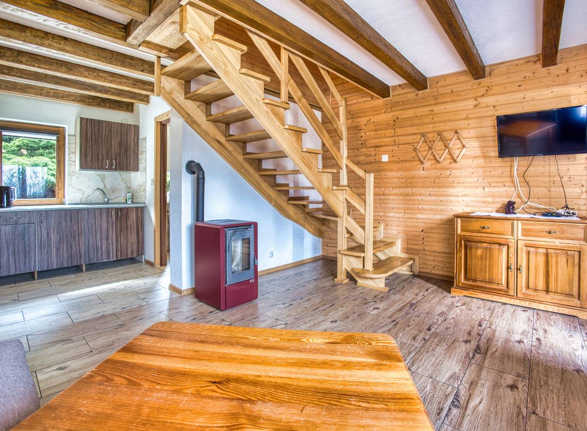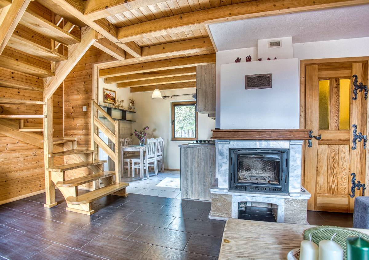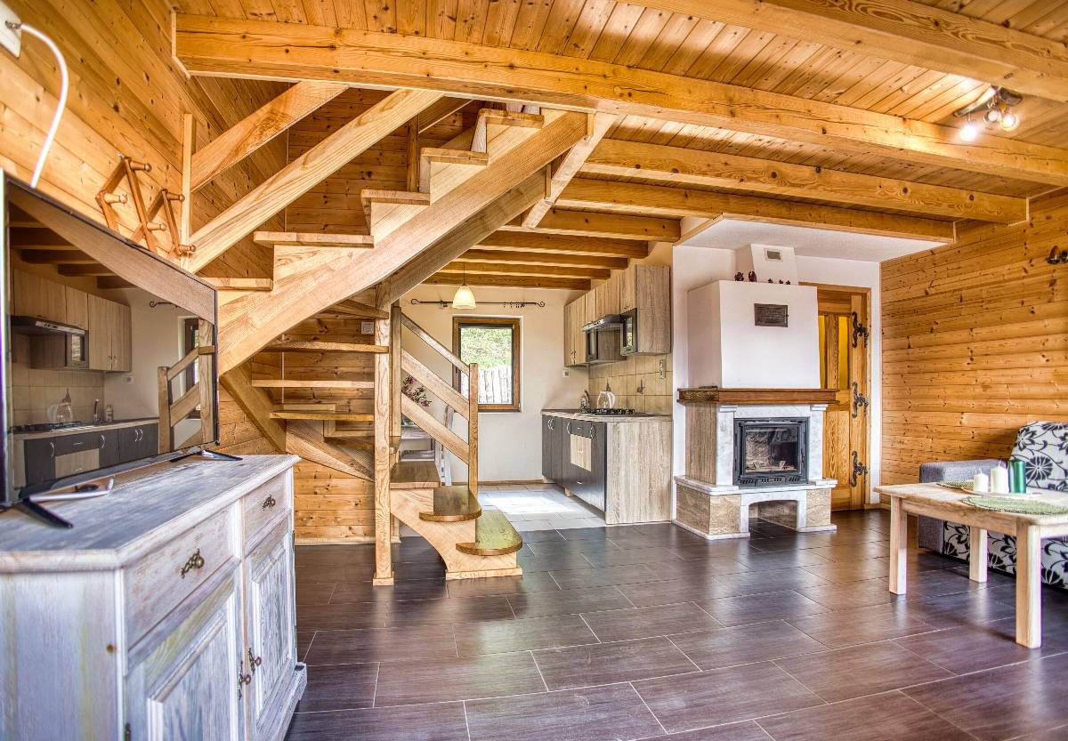 – Dwa poziomy: salon z kominkiem, aneks kuchenny, łazienka, dwie sypialnie na piętrze