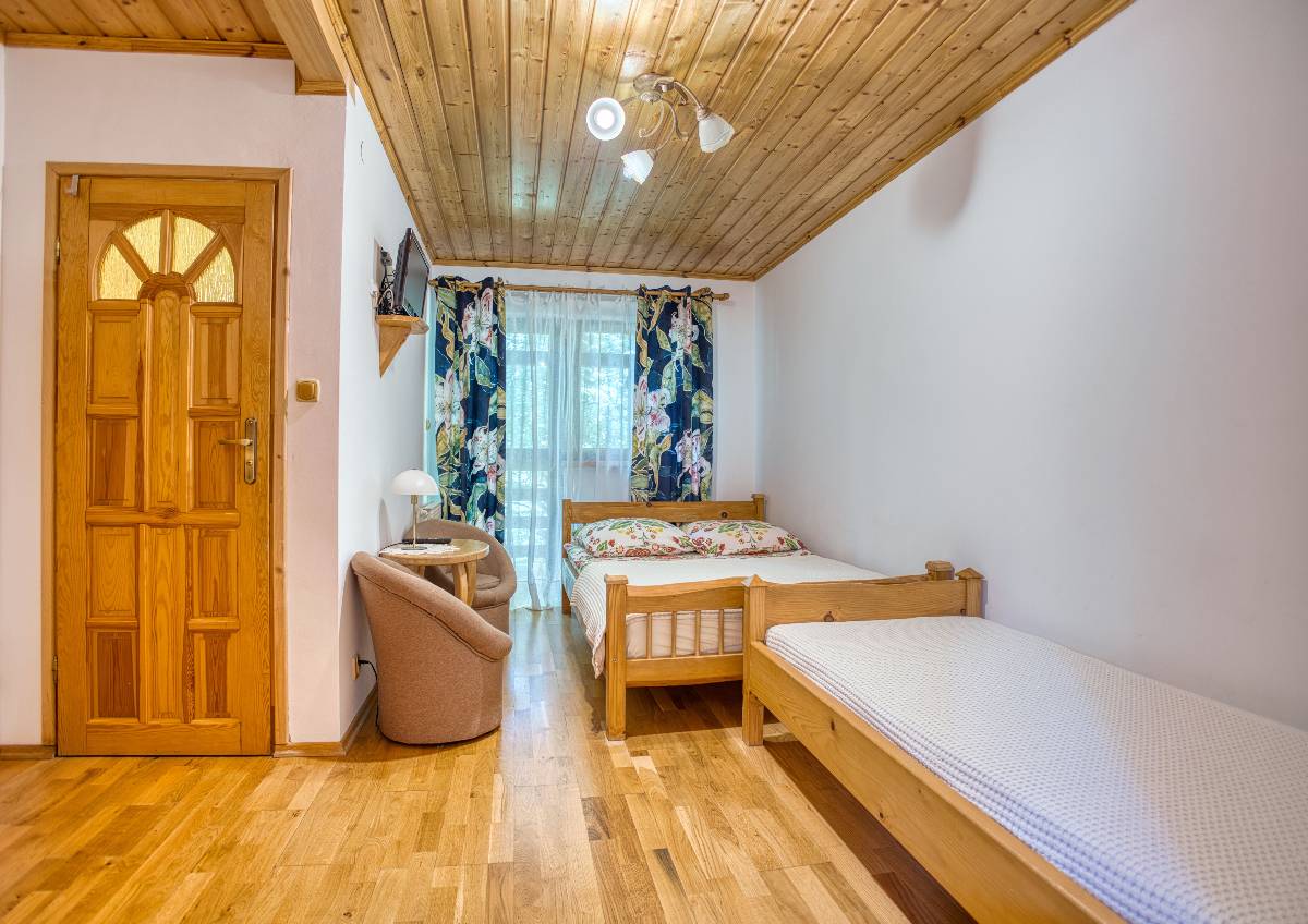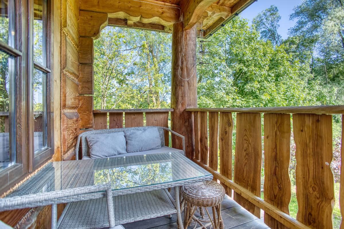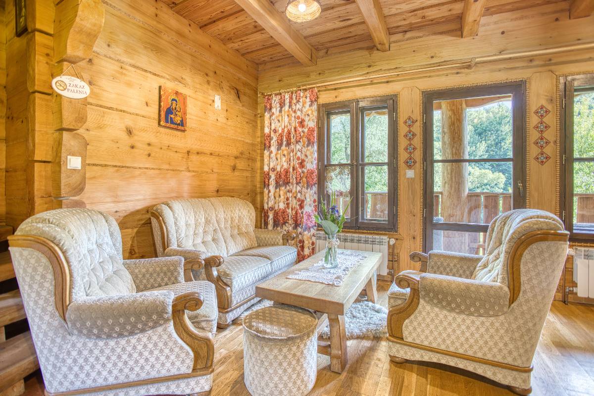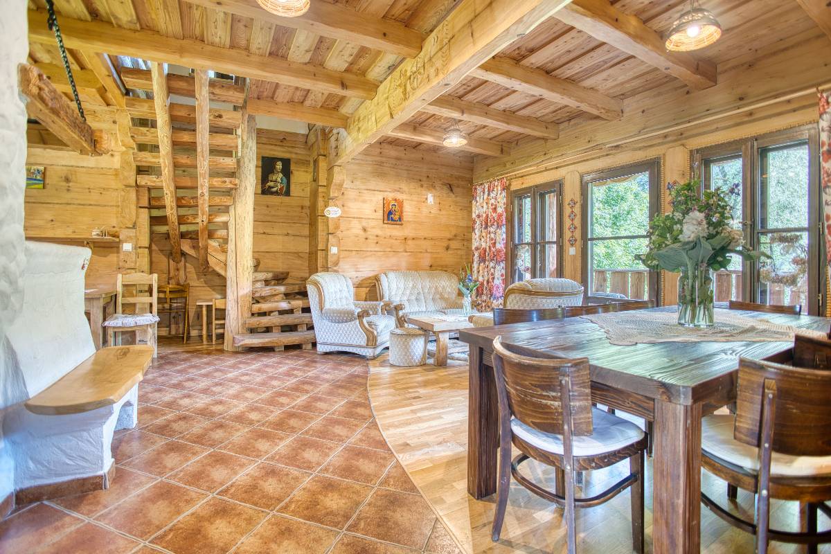 - 🏡 Domek Łemkowski – stylowy dom z bali dla rodzin i grup, z 3 sypialniami, 2 toaletami, kuchnią, salonem i przestronnym tarasem z widokiem na las.