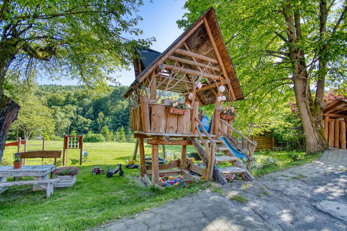 - 🎠 Plac zabaw – domek na drzewie, trampolina, huśtawki, piaskownica,