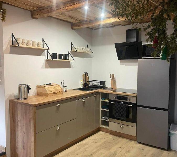 - Każdy apartament wyposażony jest w nowoczesną kuchnię z lodówką, zmywarką, piekarnikiem, płytą kuchenną i czajnikiem.