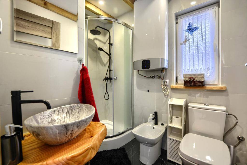 - 🚿 Łazienka z prysznicem, bidetem, suszarką do włosów, ręcznikami i kosmetykami,