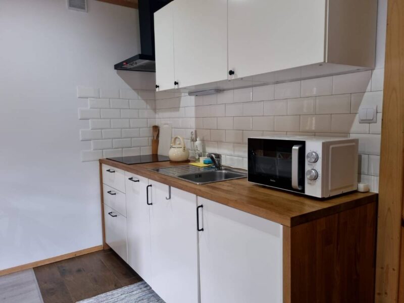 ✔ W pełni wyposażoną kuchnię (lodówka, zmywarka, płyta grzewcza) – gotuj jak w domu