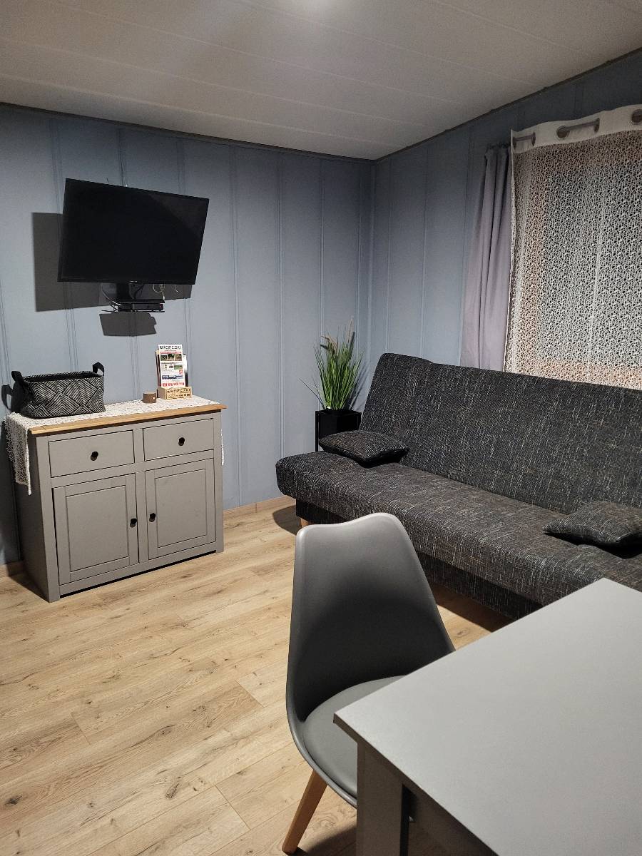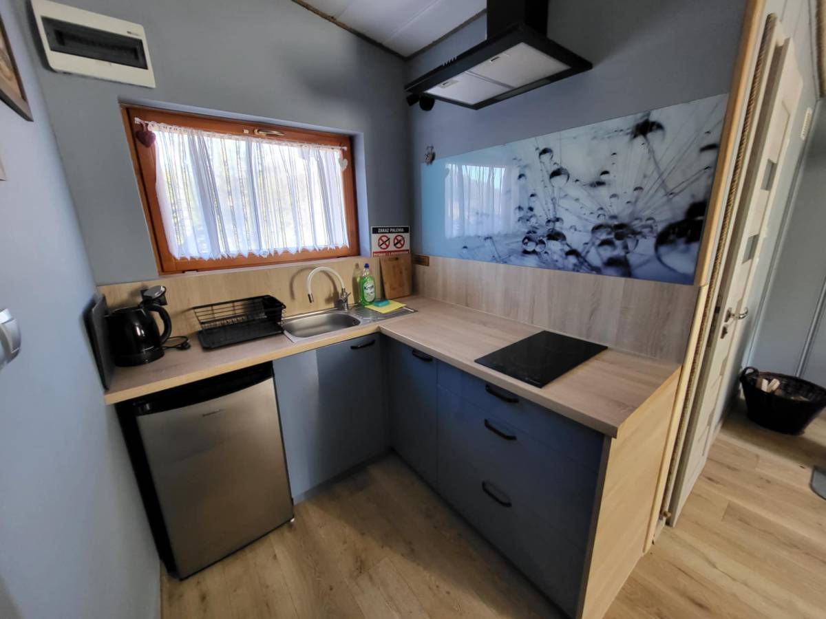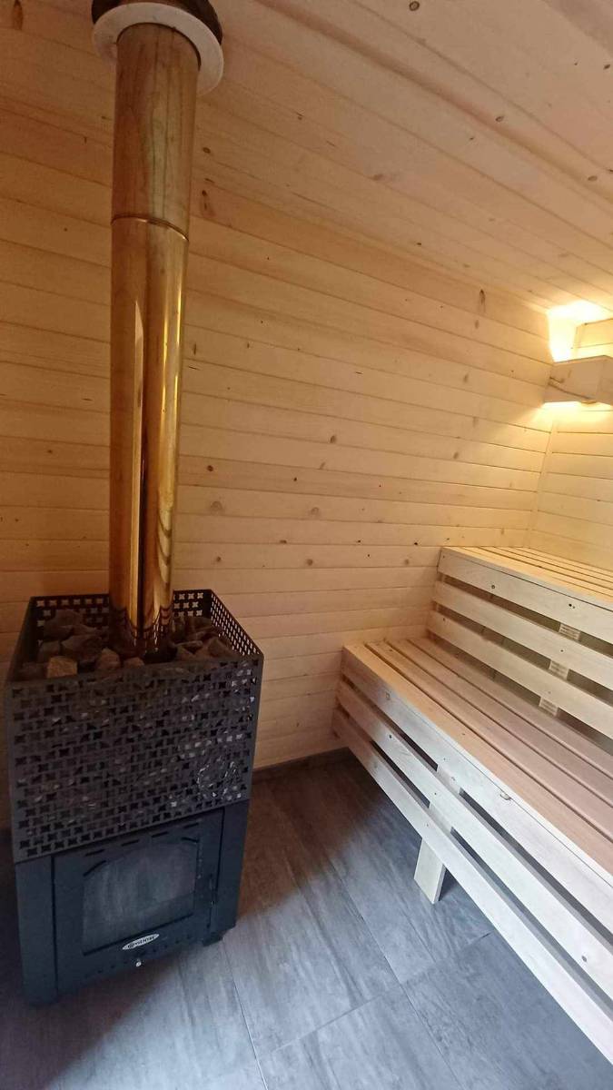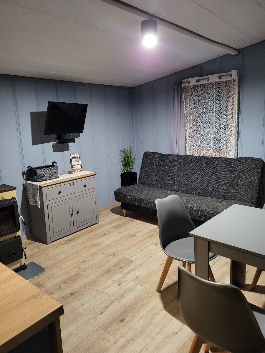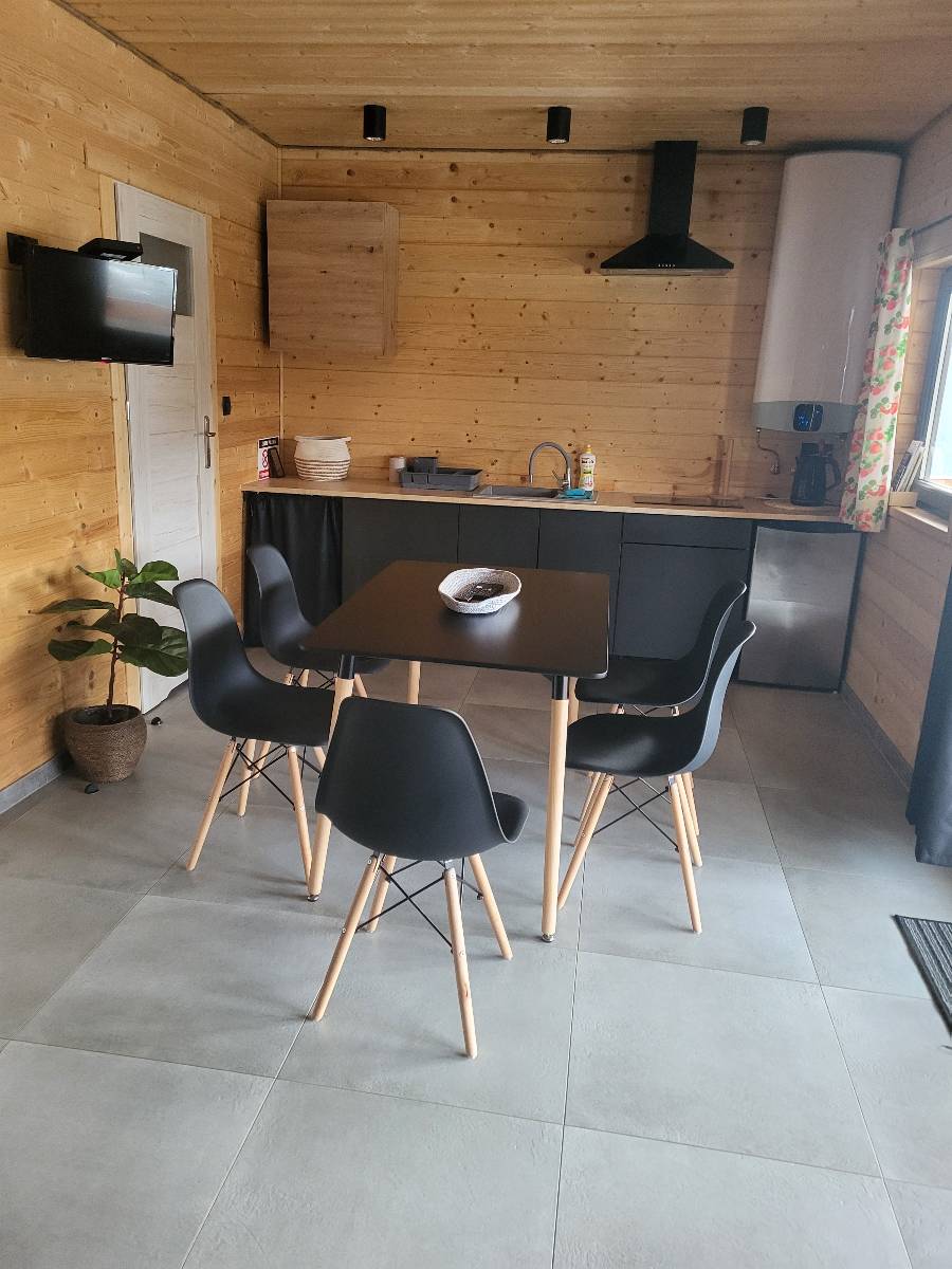 Łazienka, wyposażona w toaletę, prysznic i umywalkę, zapewnia komfort i prywatność. Domek jest ogrzewany za pomocą kominka, co dodaje uroku wnętrzom, a także posiada ogrzewanie podłogowe w sypialni i łazience, zapewniając ciepło w chłodniejsze dni. Rozrywka dla gości jest zapewniona dzięki Smart TV, a stół z krzesłami umożliwia wspólne posiłki.