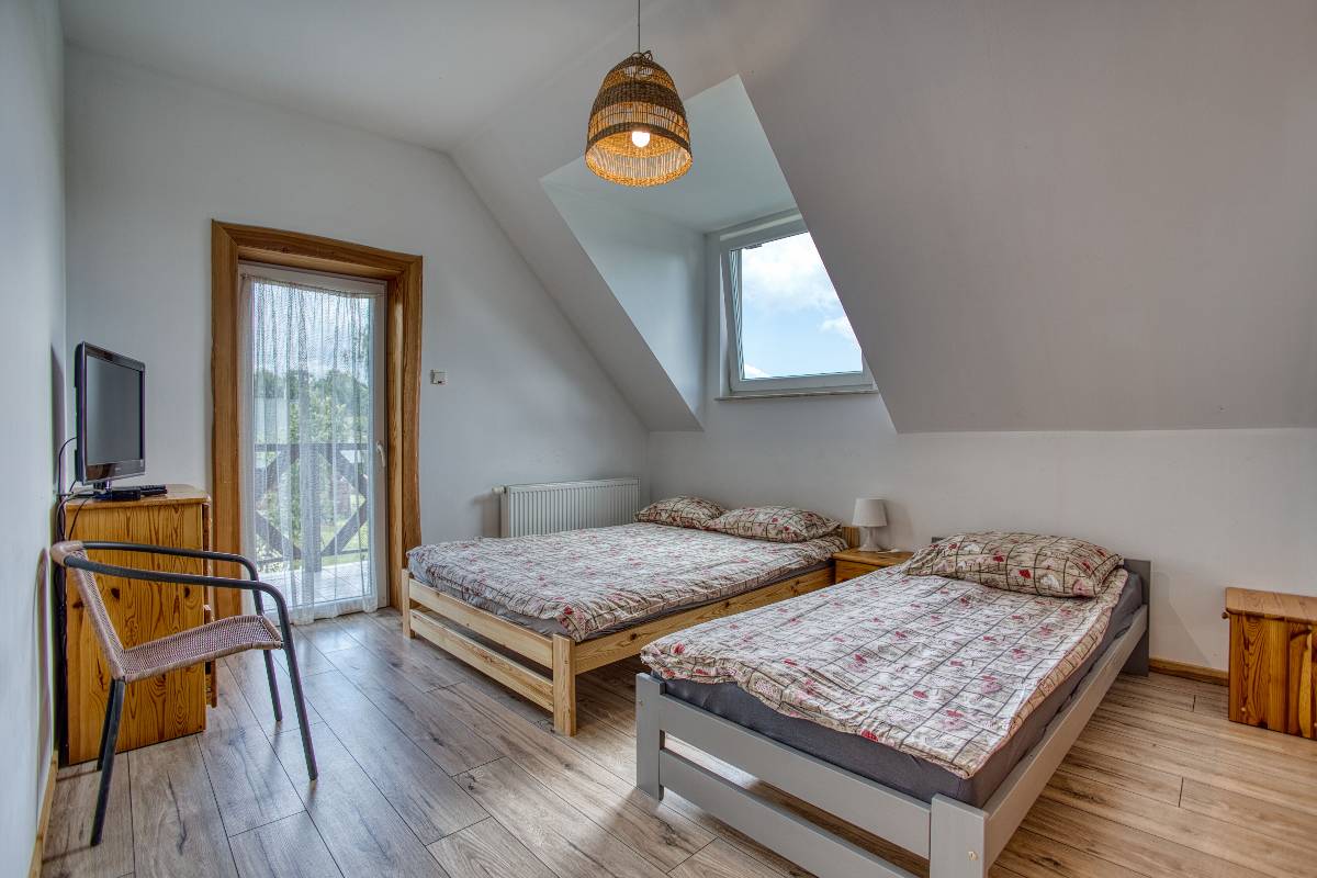 - 🛏️ 6 pokoi – 2 trzyosobowe z prywatnymi łazienkami oraz 4 dwuosobowe,