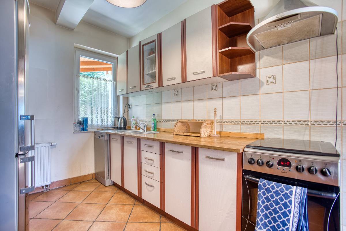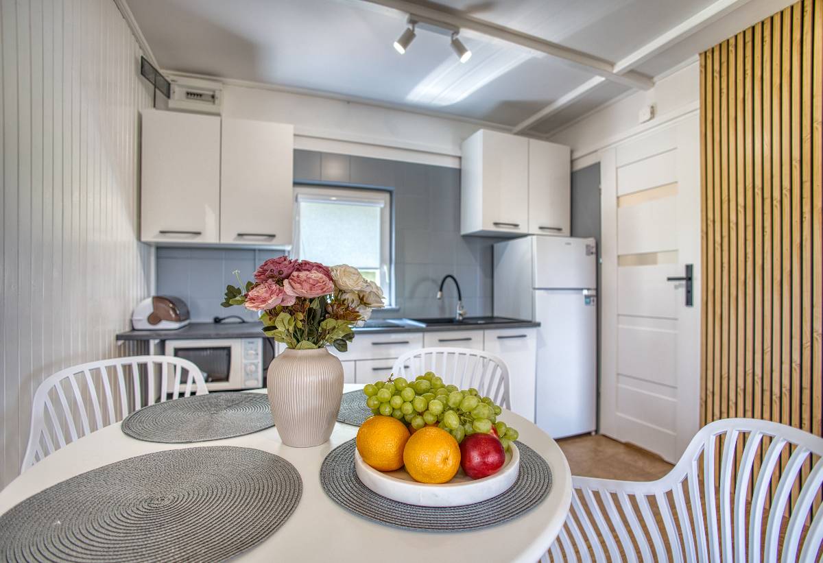 - 🍽️ W pełni wyposażona kuchnia – zmywarka, lodówka, płyta, mikrofalówka, naczynia i sztućce,