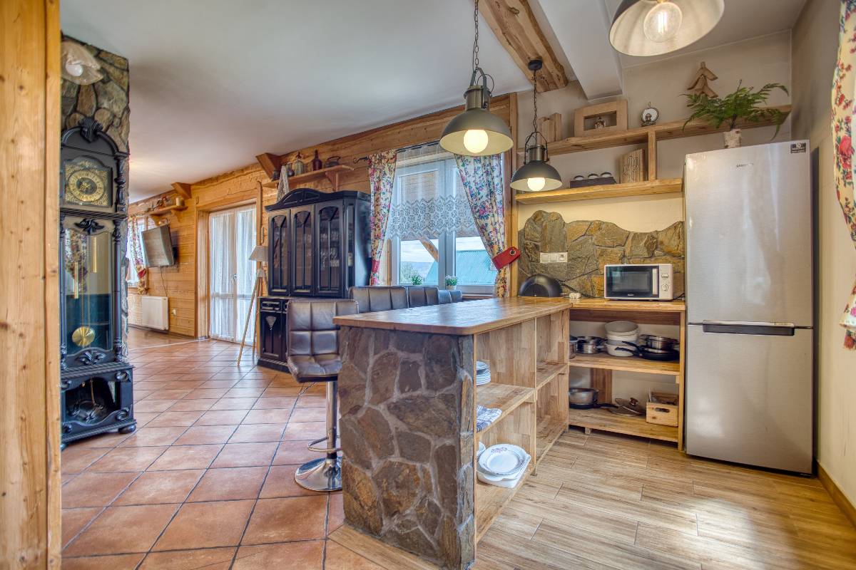 - 🍴 Aneks kuchenny – lodówka, kuchenka, czajnik, talerze, sztućce, garnki, mikrofalówka,