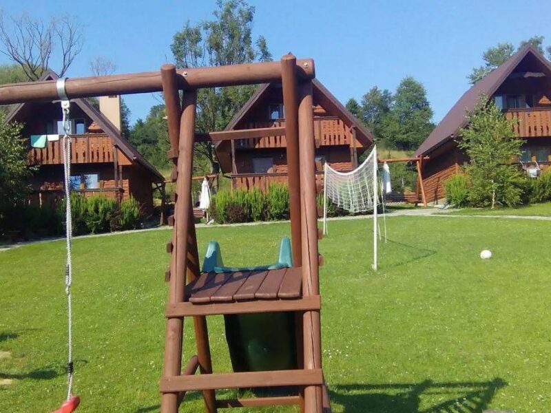 Przed domkami rozciąga się przestronny trawnik z placem zabaw i miejscem do gry w siatkówkę. Na terenie znajduje się również wiata z murowanym grillem, idealna na rodzinne biesiady. Parking jest duży, a teren ogrodzony dla poczucia prywatności.