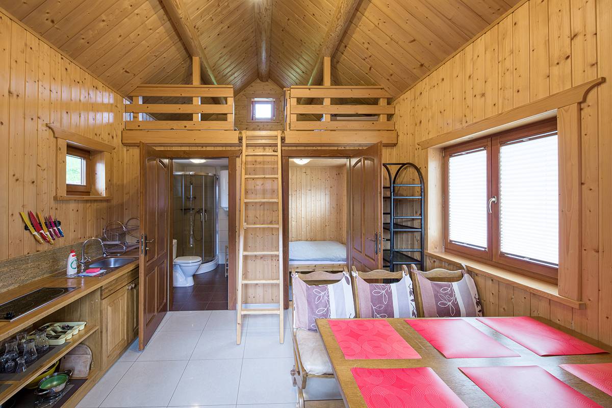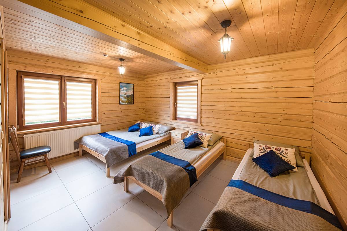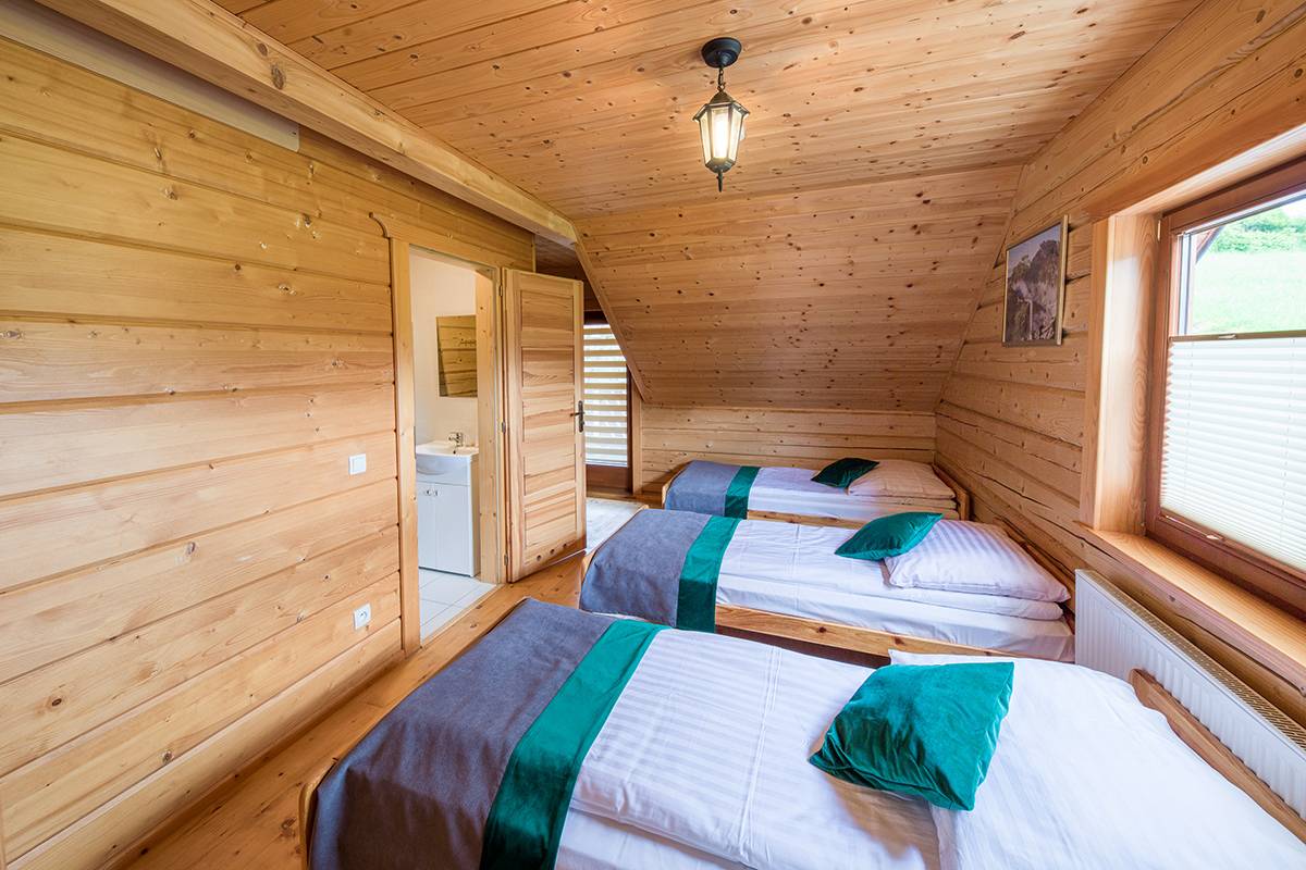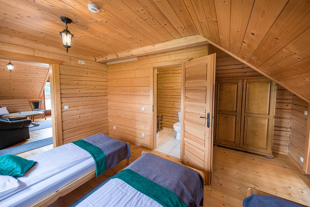 - ⛰️ Dwa domki góralskie – jednorodzinne, z łazienką, aneksem kuchennym i tarasem.