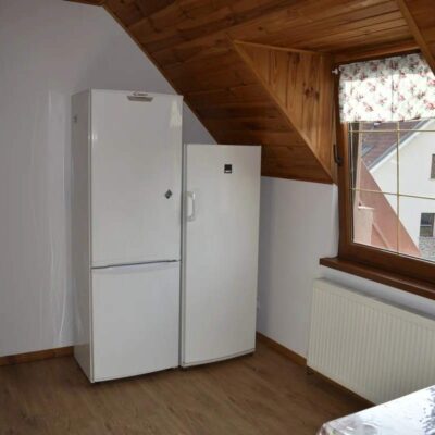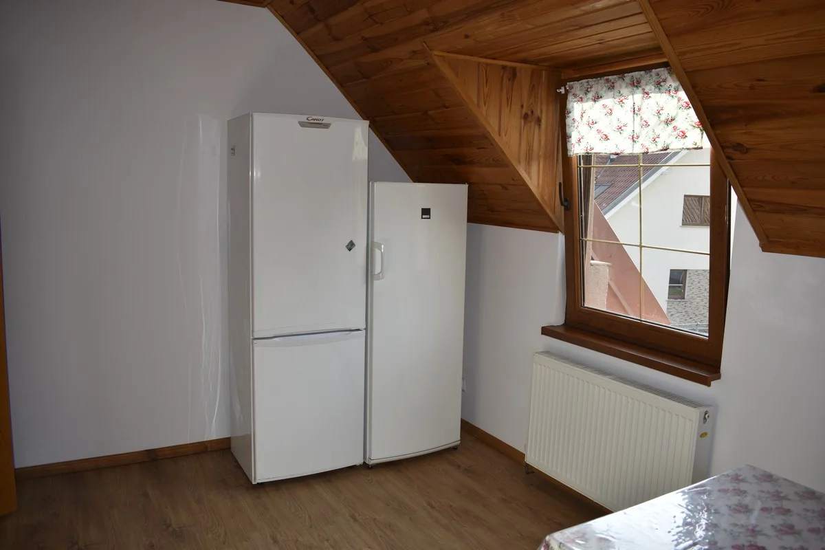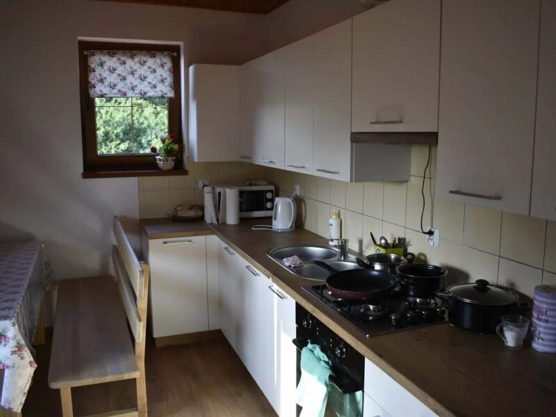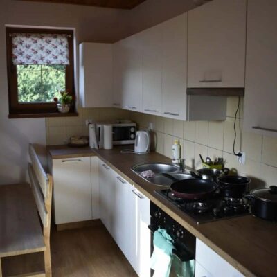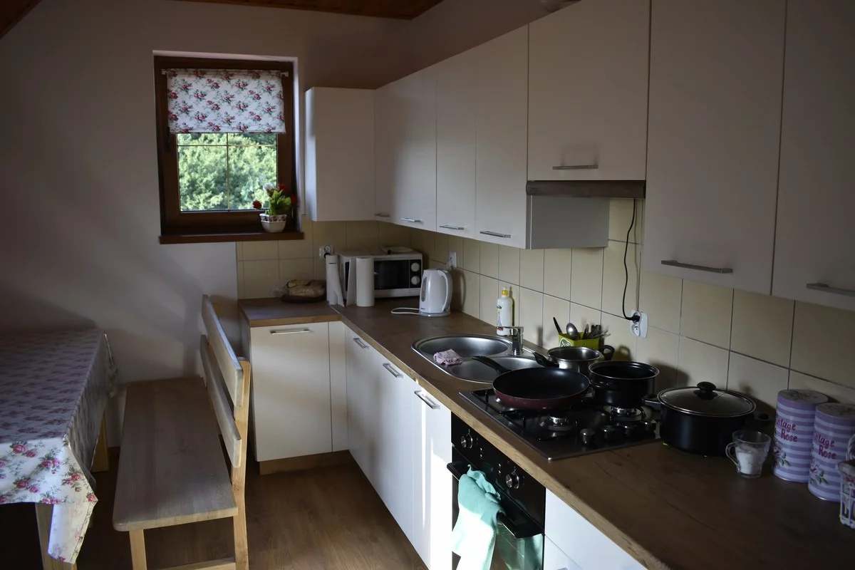- 🍽 W pełni wyposażoną kuchnię z aneksem jadalnym (lodówka, kuchenka gazowa, mikrofalówka)