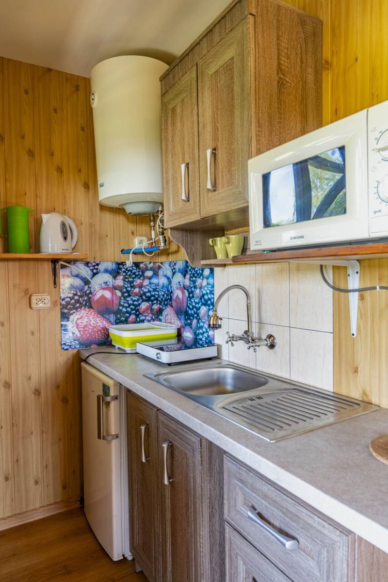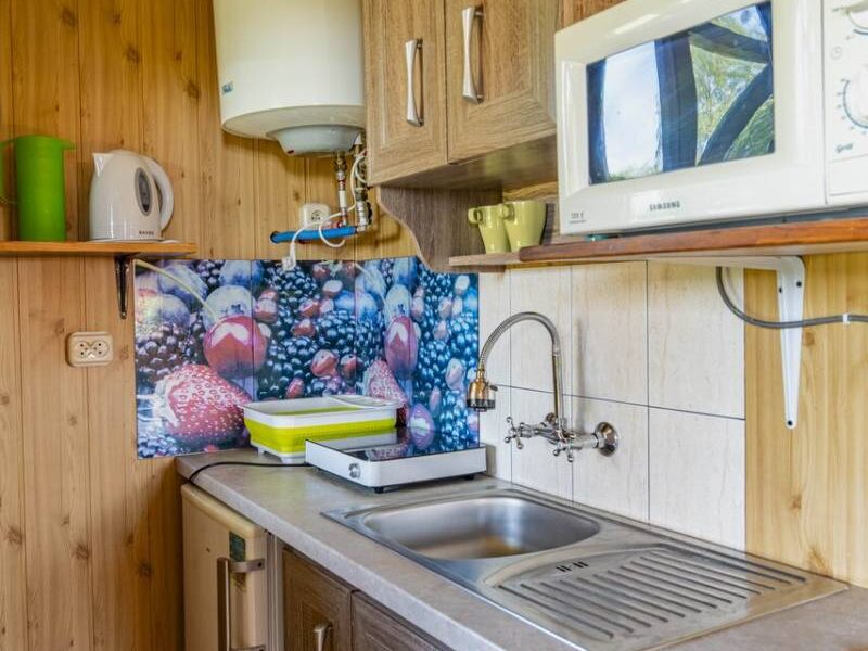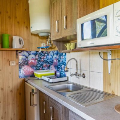 - 🍽 Kuchnię z lodówką, czajnikiem, mikrofalówką, kuchenką elektryczną i pełnym wyposażeniem