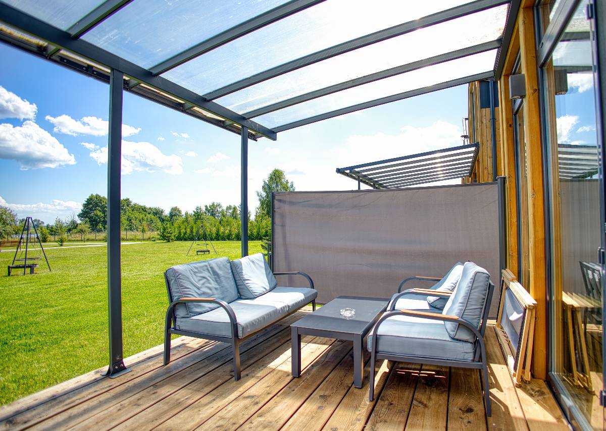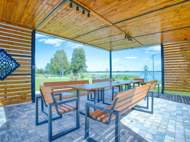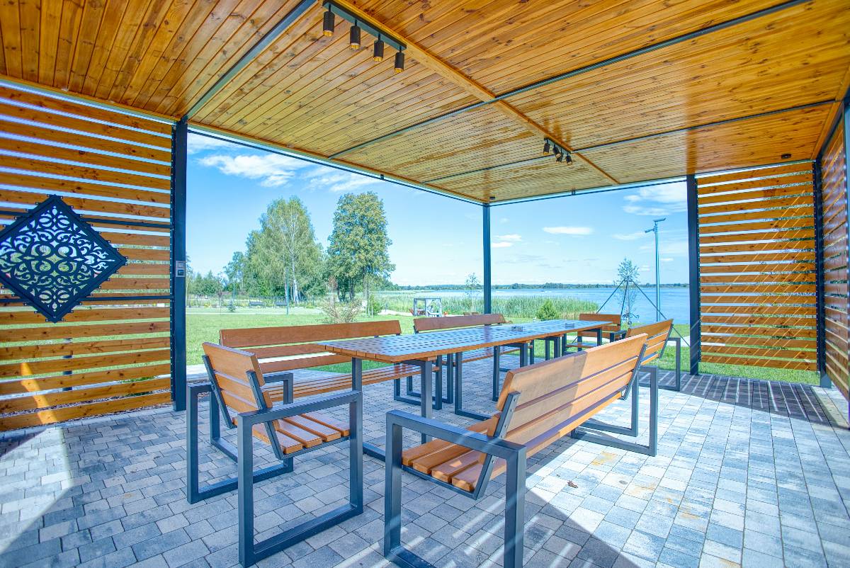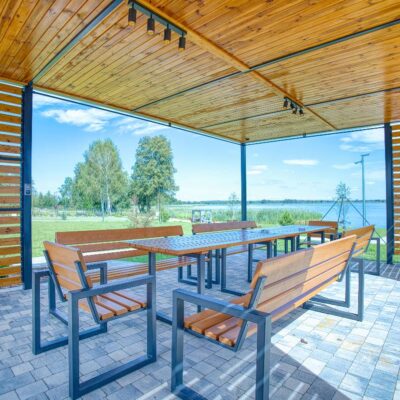 🌅 Taras: Zadaszony taras z meblami ogrodowymi i widokiem na jezioro.