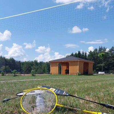 - 🌳 Ogrodzony teren 6000 m²: miejsce na ognisko, altana, plac zabaw, boiska do siatkówki i badmintona