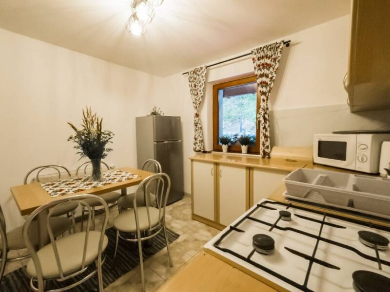 - 🍽️ W pełni wyposażona kuchnia – lodówka, mikrofalówka, piekarnik, czajnik, garnki, talerze i sztućce,